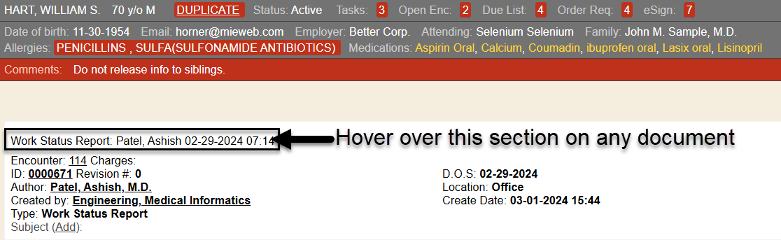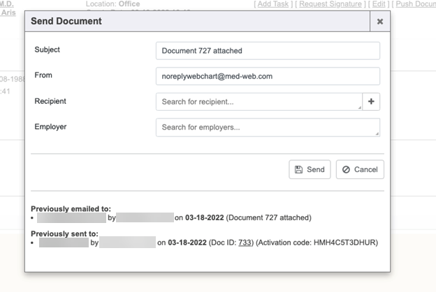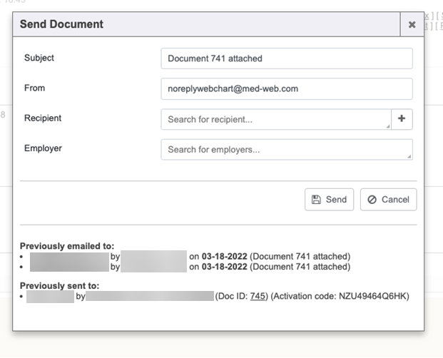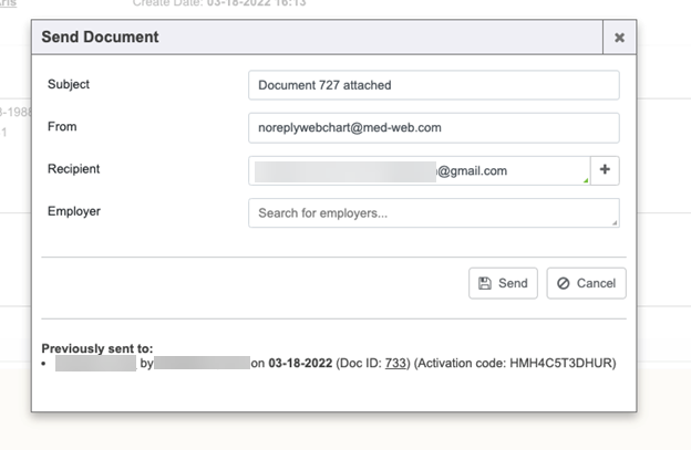 Notice the “Previously sent to” section lists the recipient information with links to the chart and the new “Received Document” (Doc ID 733). We also display the “Activation code” that was used.