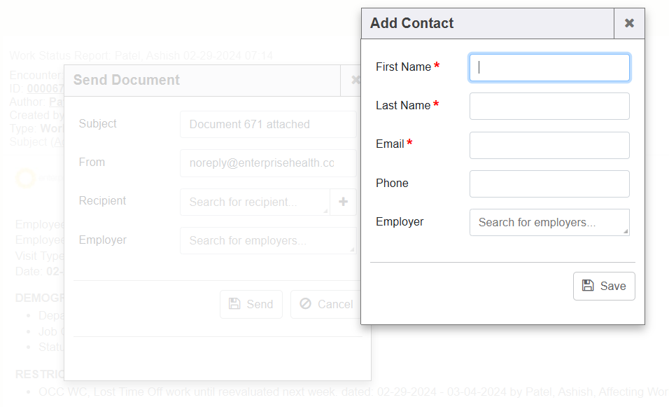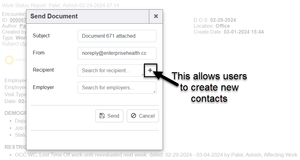 After the screen is saved, it will populate the new information into the “Recipient” input on the “Send Document” window