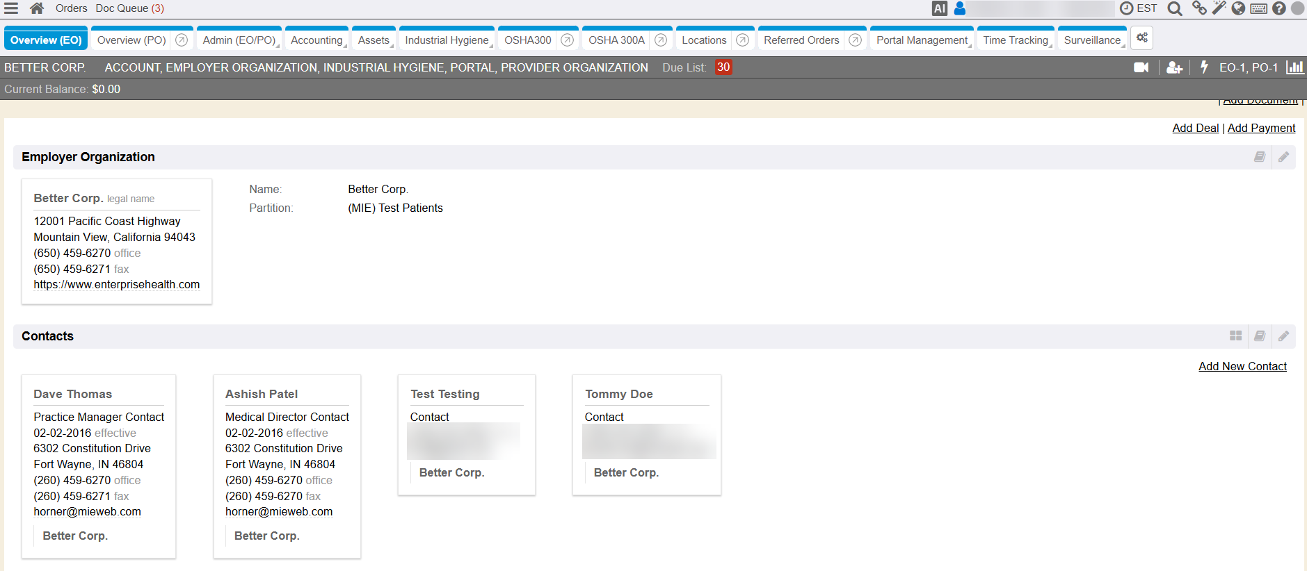 Users are also able to select an “Employer” and perform the above actions on the related contacts. Related contacts are found under the employer’s Overview (EO) chart tab in the Contacts section. These contacts have to be active users in the system, which means they need to be Login Enabled and have credentials to access the system.