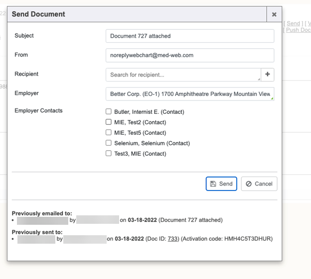 You can then select the ones that they want to send the document to. The actions that happen next, depend on the user’s email address and whether it’s white listed, or not. We DO NOT generate activation codes on “Employer Contacts”. The assumption is that these contacts are already active users and do not need to create an account.