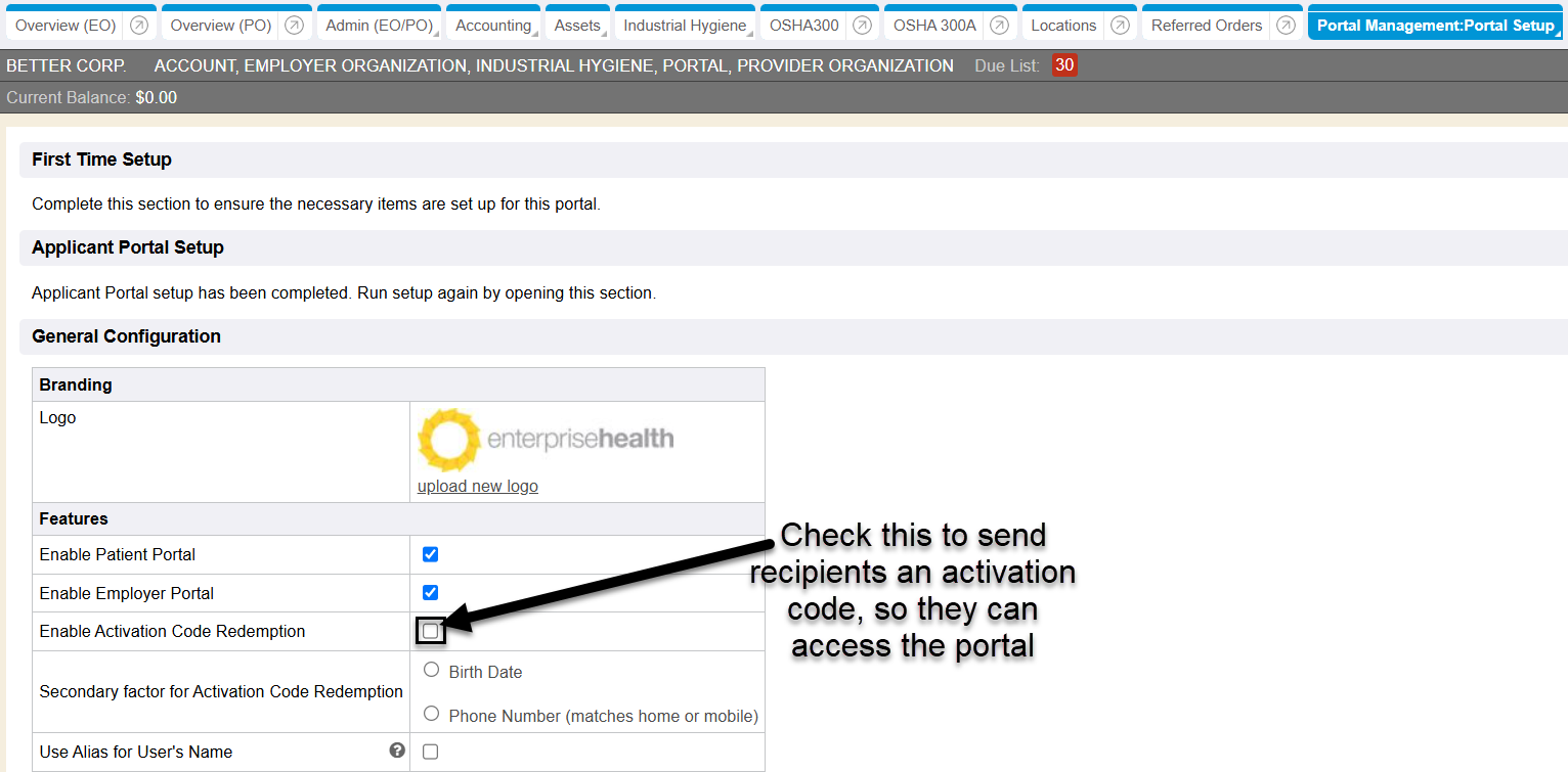 1. “Portal Setup” chart tab - “Enable Activation Code Redemption”